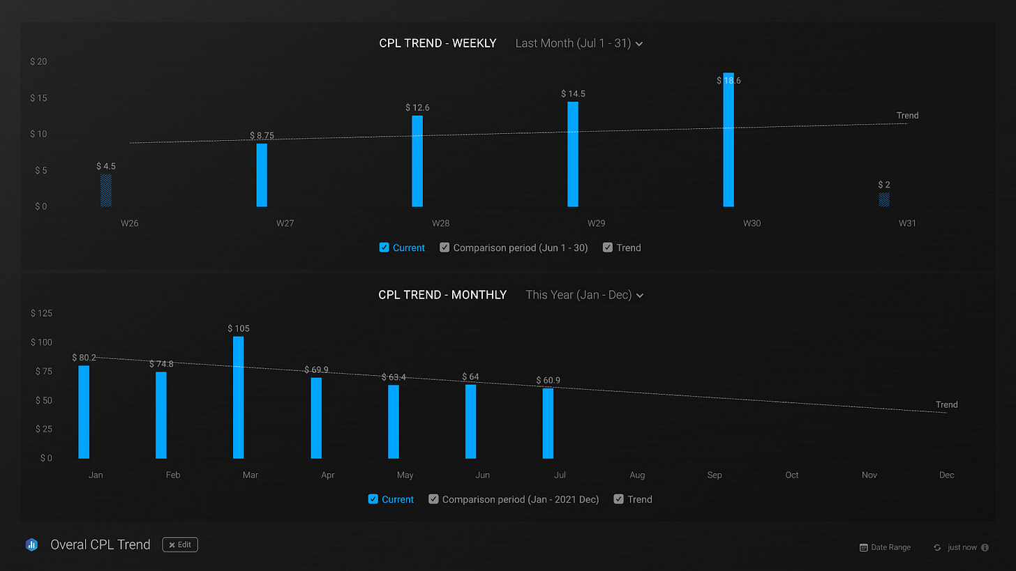 Using a CPL trend dashboard allows us to gain perspective of how much we are paying per qualified lead on a monthly basis. This information will enable us to make strategic decisions and prioritize spending across channels.