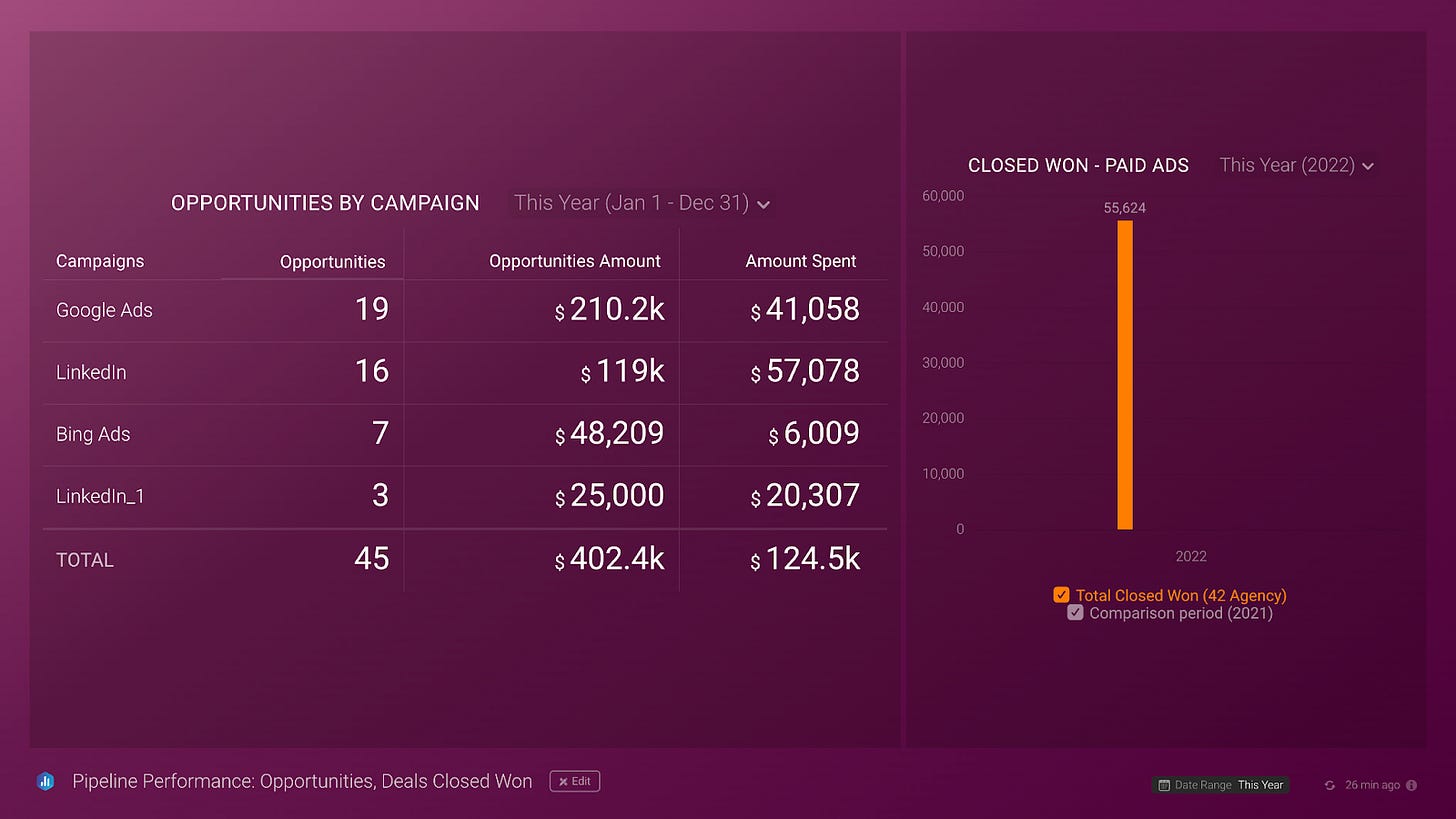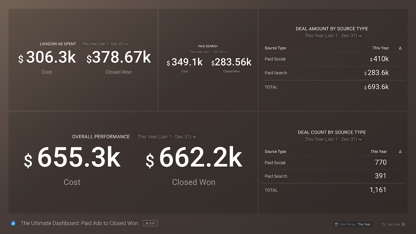 Paid media to pipeline data monitoring is key, as a great-performing Ad that does not translate into the pipeline is not very useful. Databox helps us create a dashboard that directly connects our paid media activities to our pipeline data from a CRM like Hubspot. This means we can correlate paid media metrics with pipeline metrics like deal amount, deal count by source type, closed-won amount by source type, and more. It is definitely a helpful dashboard to further leverage paid media budgets and their impact on business growth!