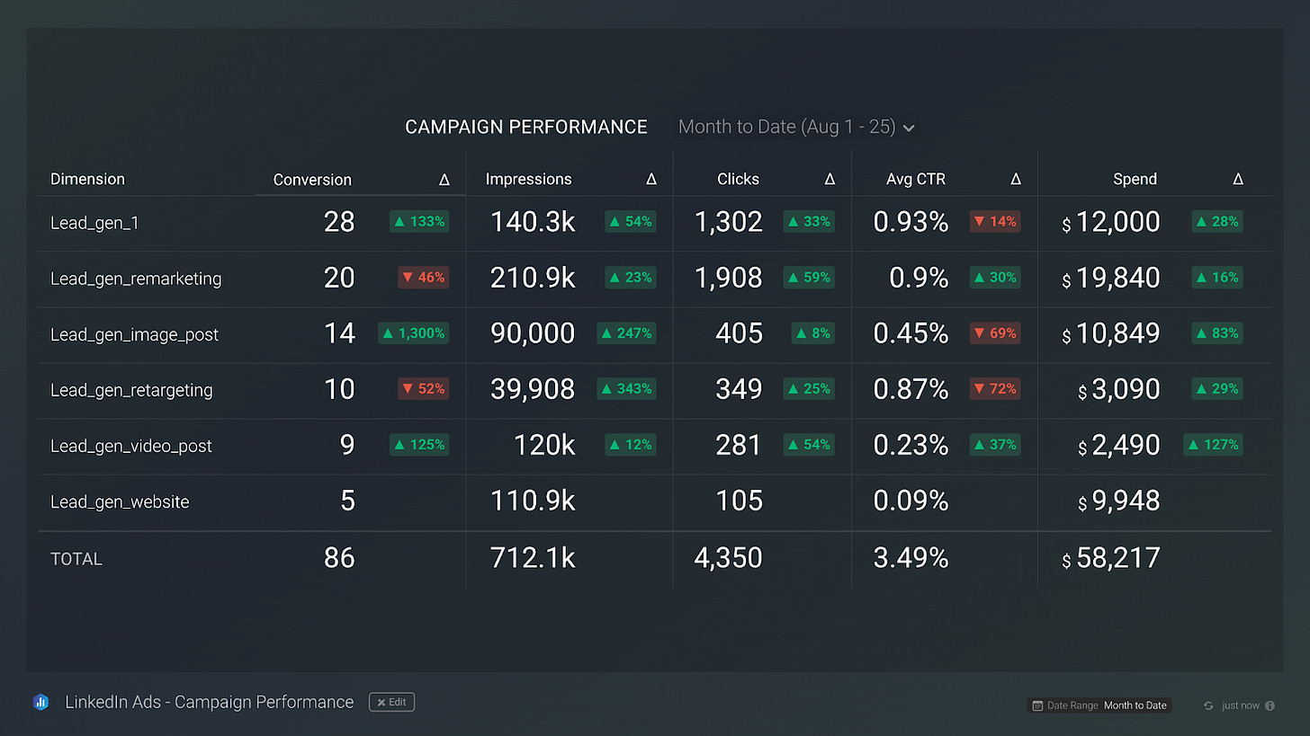 When it comes to campaign-level metrics, having access to this dashboard allows us to track which campaigns may be contributing to lower performance. Check out the example below: