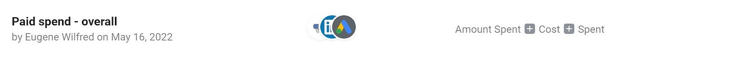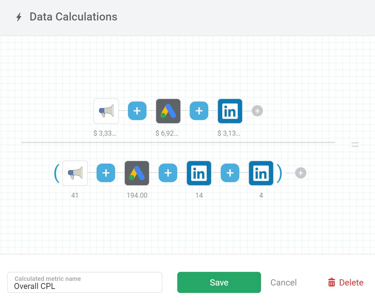 In the following example, we are calculating the overall CPL metric across Google ads, LinkedIn ads, and Facebook ads: